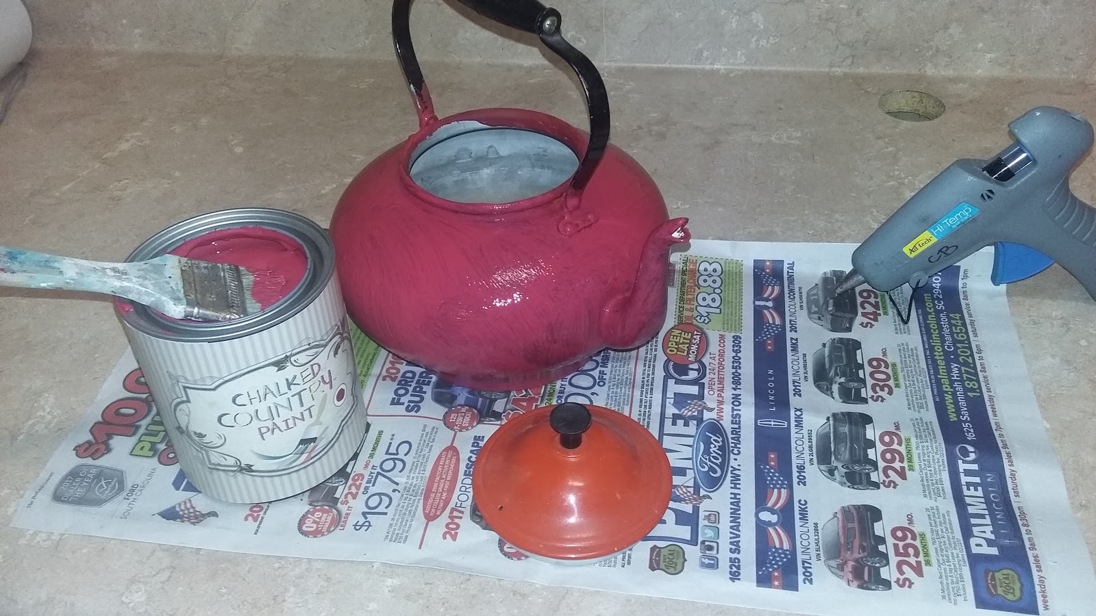 I used Chalked Country Paint King's Carpet and a coat of dark wax to get that dark, rich, ruby red finish. As you can see the teapot was orange.