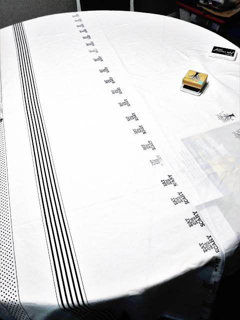 Using Archival permanent ink, I stamped two separate designs in stripes along the tablecloth. I used an opened magazine as a guide for underneath and followed the line above to stamp my first line and then I repeated the same process for the second design. This ink is permanent and washable once it is dry.
