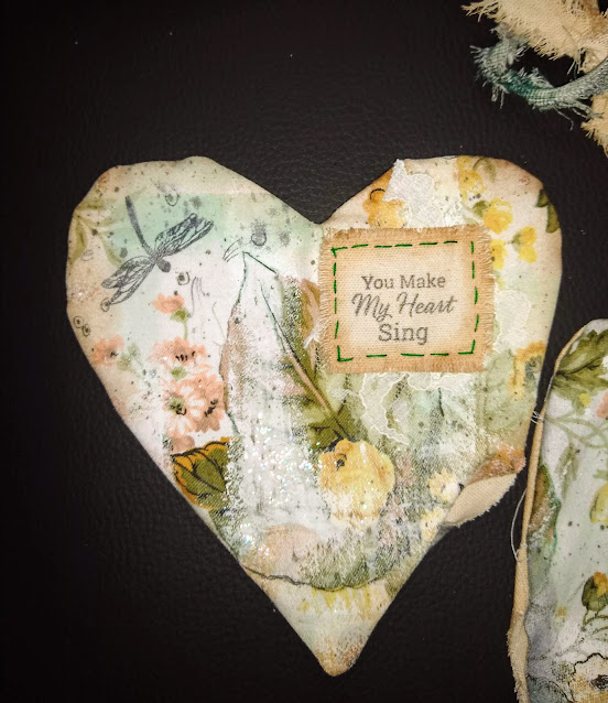 You'll notice that I aged around the edges of the fabric , added a dragonfly stamp, speckled the fabric canvas with black paint and used a permanent black fine marker to add a few dots and outlines here and there. Basically I'm creating a mixed media art background for my hearts.